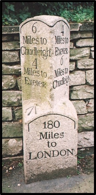 Milestones Grade II listed in September 2017 can be found at Alphington, Kenn, Harcombe and Chudleigh.
