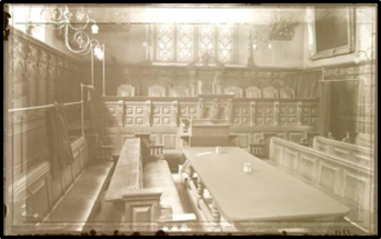The glass plate negative digitally enhanced of the Exeter Guildhall courtroom. Thanks to the Guildhall for this image.